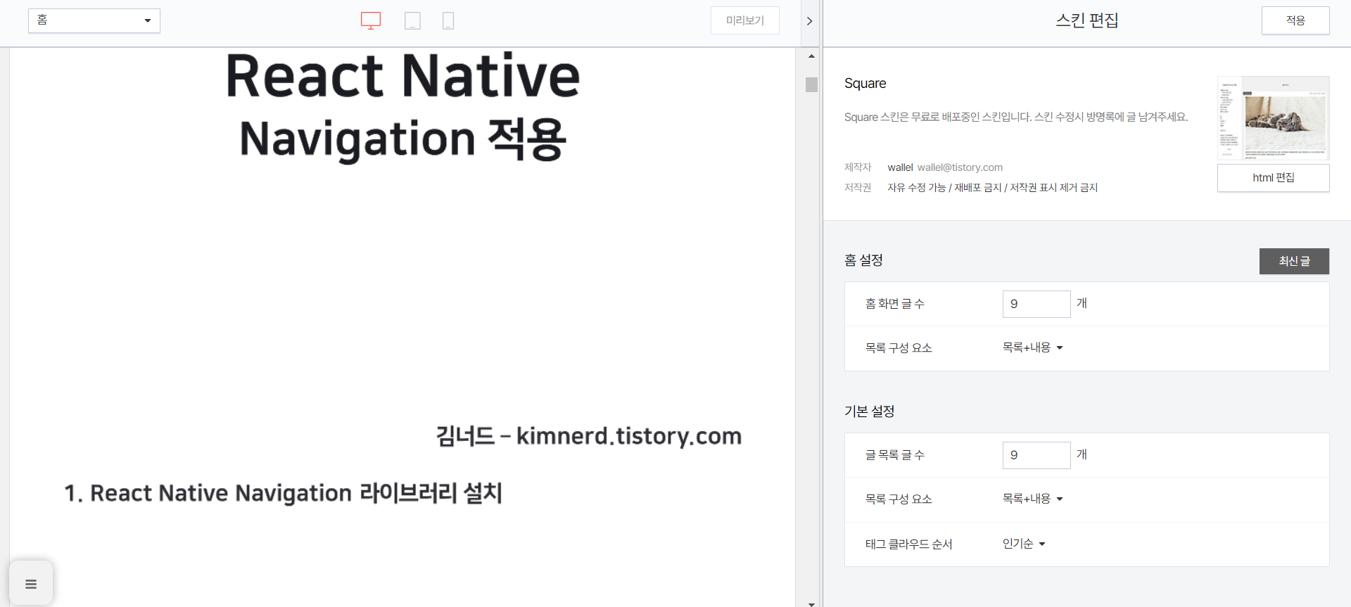 마지막으로 홈 설정과 기본 설정의 글 수를 9개로 설정합니다.