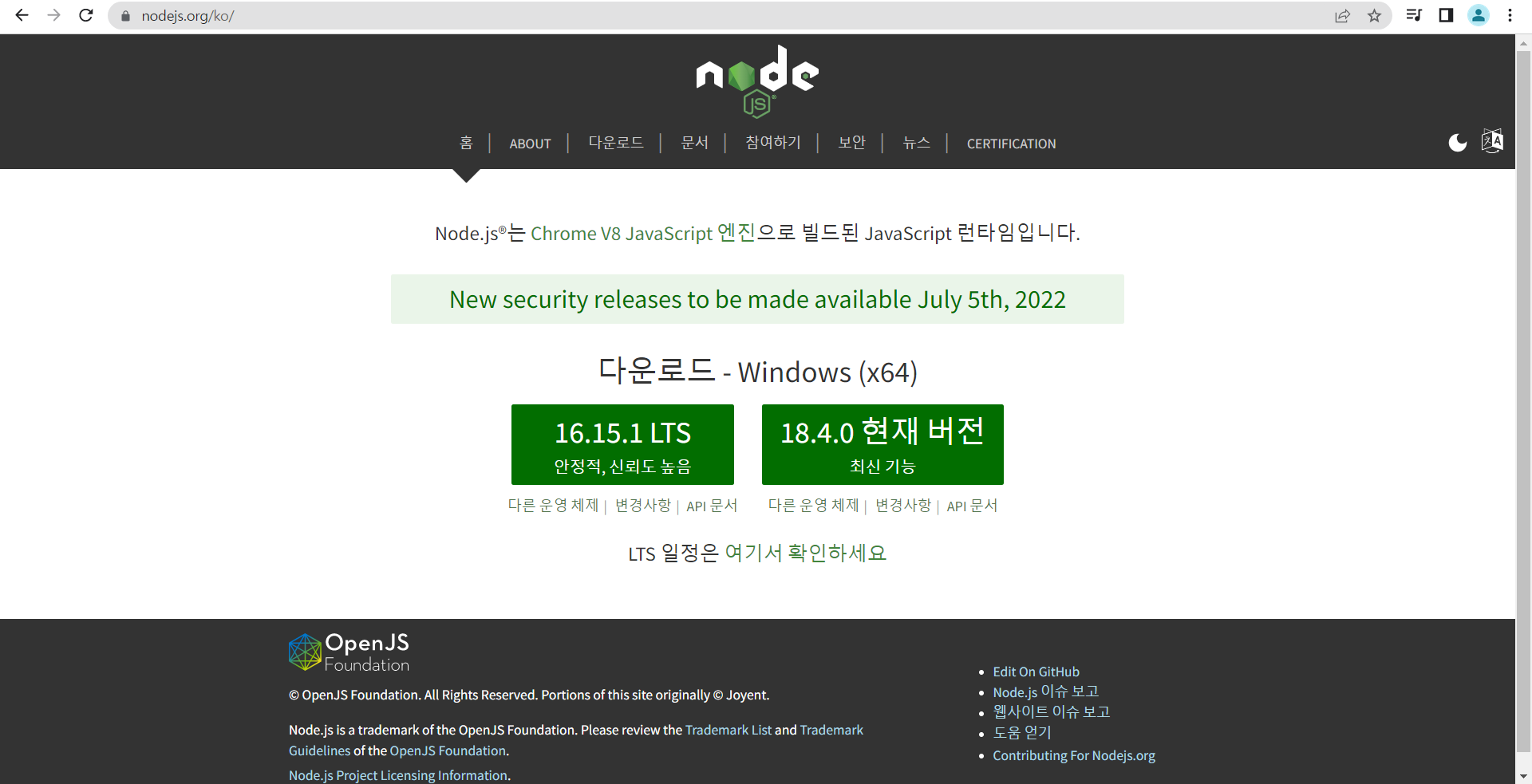 입문자 입장에서 안정성과 신뢰도가 높은 LTS 설치 및 사용을 권장